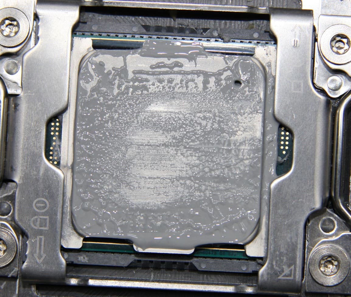 Преднанесенного термоинтерфейса нет, но производитель приложил к кулеру небольшой шприц с термопастой MasterGel Pro, количества которой явно хватит не на один раз. Забегая вперед, продемонстрируем распределение термопасты после завершения всех тестов. На процессоре: