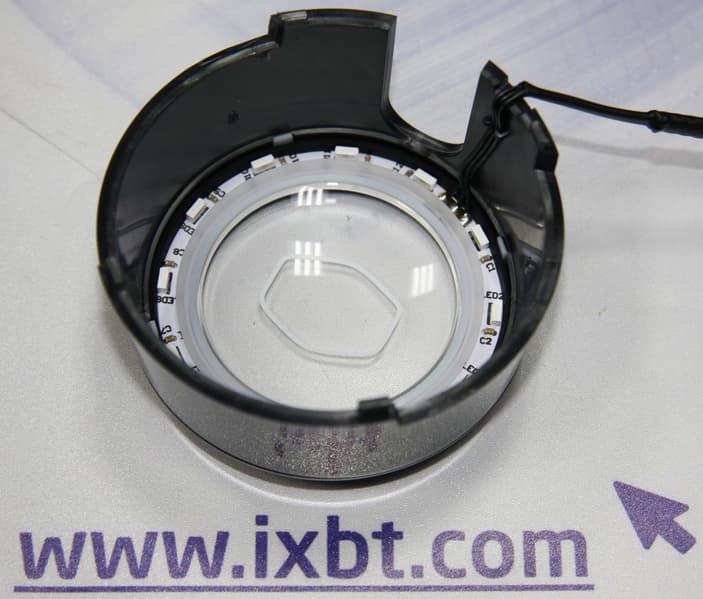 На крышке изнутри по кругу расположены 12 адресуемых многоцветных светодиодов (ARGB), управляемых извне по трехпроводному интерфейсу. Пыль под окно крышки не допускает кольцевая прокладка из упругого пластика.