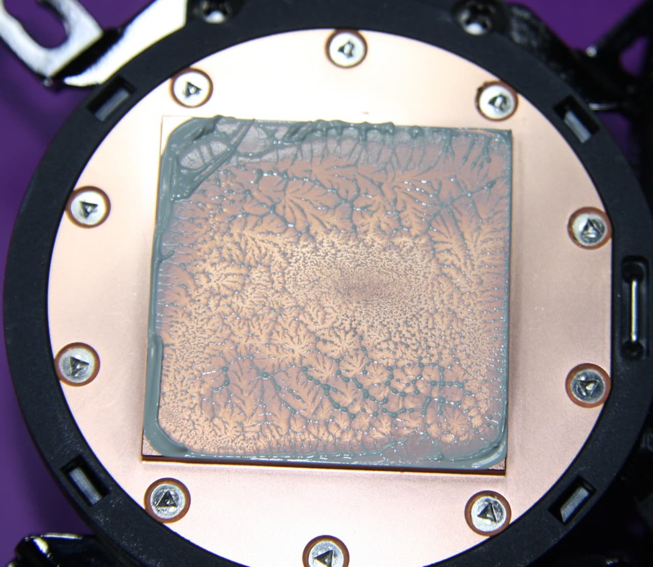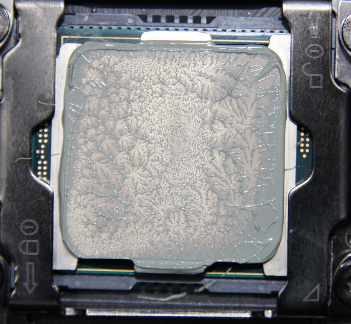 Габариты выступающей части — 40×40 мм. Термопаста в маленьком шприце, что, конечно, менее удобно, чем преднанесенный слой. Комплектного запаса термопасты должно хватить раза на три в случае процессоров с небольшой площадью крышки. Во всех тестах использовалась термопаста другого производителя, расфасованная в шприц и чуть более жидкая. Забегая вперед, продемонстрируем распределение термопасты после завершения всех тестов. На процессоре (Intel Core i9-7980XE):