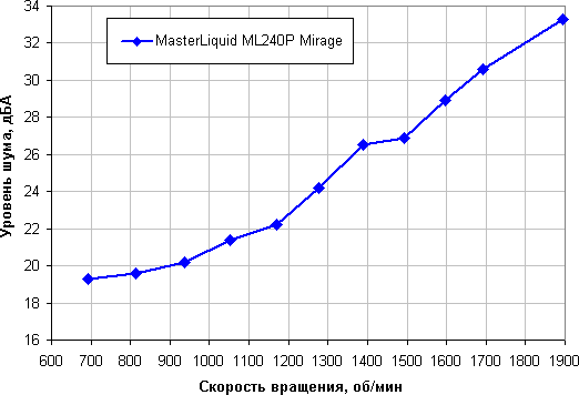Уровень шума от этой системы охлаждения низкий во всем диапазоне скорости вращения вентиляторов. Зависит, конечно, от индивидуальных особенностей и других факторов, но где-то от 40 дБА и выше шум, с нашей точки зрения, очень высокий для настольной системы; от 35 до 40 дБА уровень шума относится к разряду терпимых; ниже 35 дБА шум от системы охлаждения не будет сильно выделяться на фоне типичных небесшумных компонентов ПК — корпусных вентиляторов, вентиляторов на блоке питания и на видеокарте, а также жестких дисков; а где-то ниже 25 дБА кулер можно назвать условно бесшумным. Фоновый уровень был равен 16,8–17,1 дБА (условное значение, которое показывает шумомер).