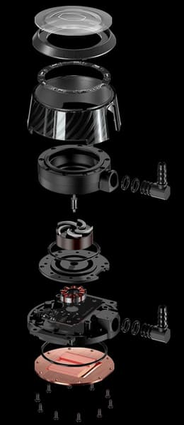 Корпус помпы изготовлен из твердого черного пластика. Сверху корпус закрыт составной крышкой из пластика с черно-серебристым покрытием. Боковую поверхность крышки опоясывает декоративный кожух из прозрачного пластика, а сверху вставлено окно из прозрачного пластика с нарисованным логотипом. Окно открывает вид на ротор помпы.