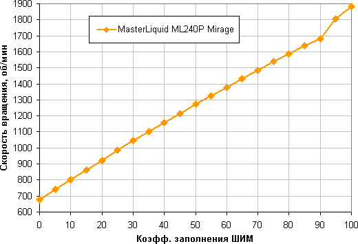 Отличный результат — почти линейный рост скорости вращения при изменении коэффициента заполнения от 0% до 100%, диапазон регулировки скорости вращения широкий. При снижении коэффициента заполнения (КЗ) до 0 вентиляторы не останавливаются. Это может иметь значение, если пользователь хочет создать гибридную систему охлаждения, которая при низкой нагрузке работает полностью или частично в пассивном режиме.