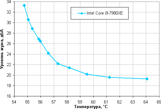 Зависимость уровня шума от температуры процессора при полной загрузке: