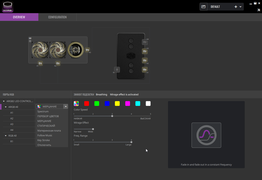 Кстати, в комплекте есть кабель, позволяющий передавать в контроллер сигнал с тахометра вентилятора (или помпы), а в кратком руководстве к контроллеру и в ПО есть упоминание о связанном с этим сигналом эффекте Mirage, но где и как он проявляется осталось невыясненным.