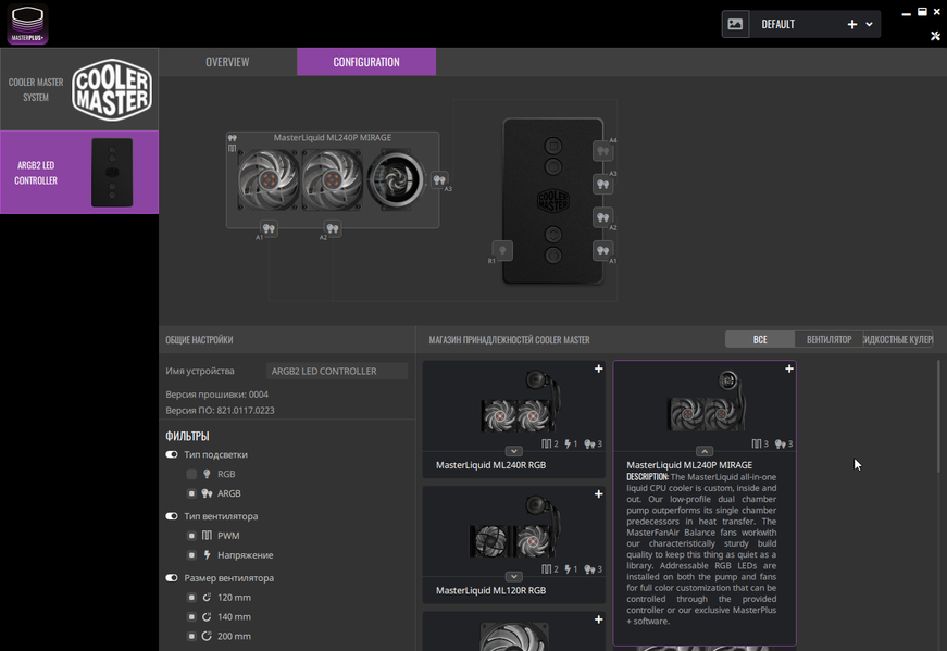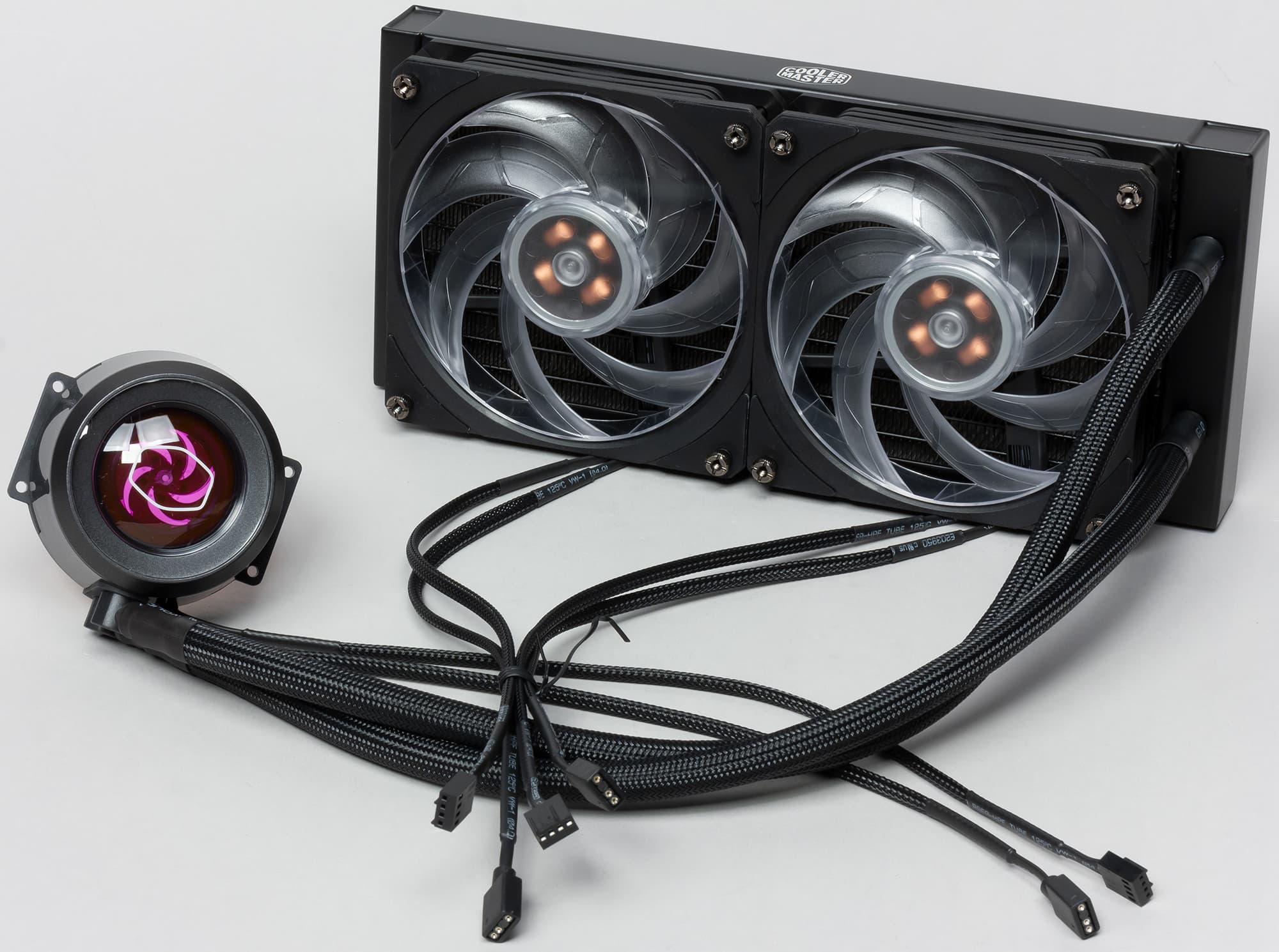 Любители моддинга оценят многоцветную и многозонную статическую или динамическую подсветку вентиляторов и помпы, имеющую стандартное трехконтактное подключение. Подсветкой вентиляторов и помпы можно управлять с помощью, например, контроллера, входящего в комплект поставки, и фирменного приложения. Среди прочих достоинств отметим хорошее качество изготовления, оплетку кабелей и шлангов (как минимум помогающую сохранить единый стиль оформления внутренностей компьютера), подключение контроллера к разъему питания SATA, удобный крепеж вентиляторов и довольно длинные шланги.