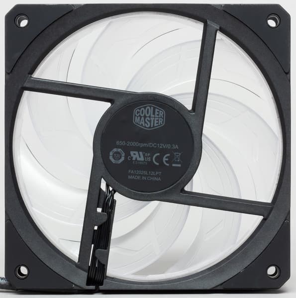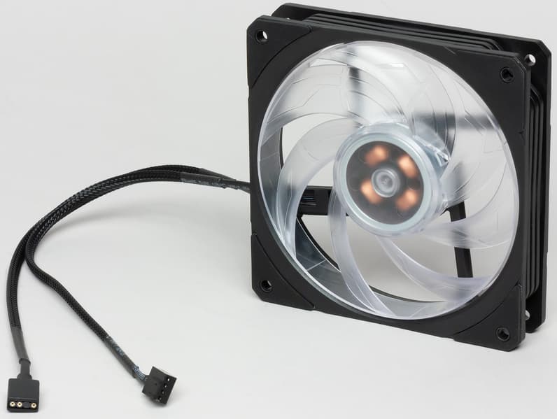 Крыльчатка вентилятора изготовлена из прозрачного пластика и снаружи слегка заматирована. Крыльчатка имеет необычную конструкцию: лопасти по внешнему краю соединены кольцом. По версии производителя, это снижает деформацию крыльчатки и улучшает стабильность вращения вентилятора. На статоре вентилятора по окружности размещены восемь адресуемых RGB-светодиодов, которые подсвечивают крыльчатку изнутри. На подсветку идет отдельный кабель с трехконтактным разъемом. Длина кабеля подсветки 30 см. Для подключения подсветки вентиляторов и помпы может использоваться удлинитель-разветвитель (21 см от контроллера плюс 3 хвоста по 20 см на устройства). Состыкованные разъемы на кабелях от устройств и на разветвителе можно зафиксировать специальными скобками из пластика, входящими в комплект. Если на материнской плате или на другом контроллере подсветки есть стандартный трехконтактный разъем для подключения ARGB-подсветки, то контроллер из комплекта можно не использовать.
