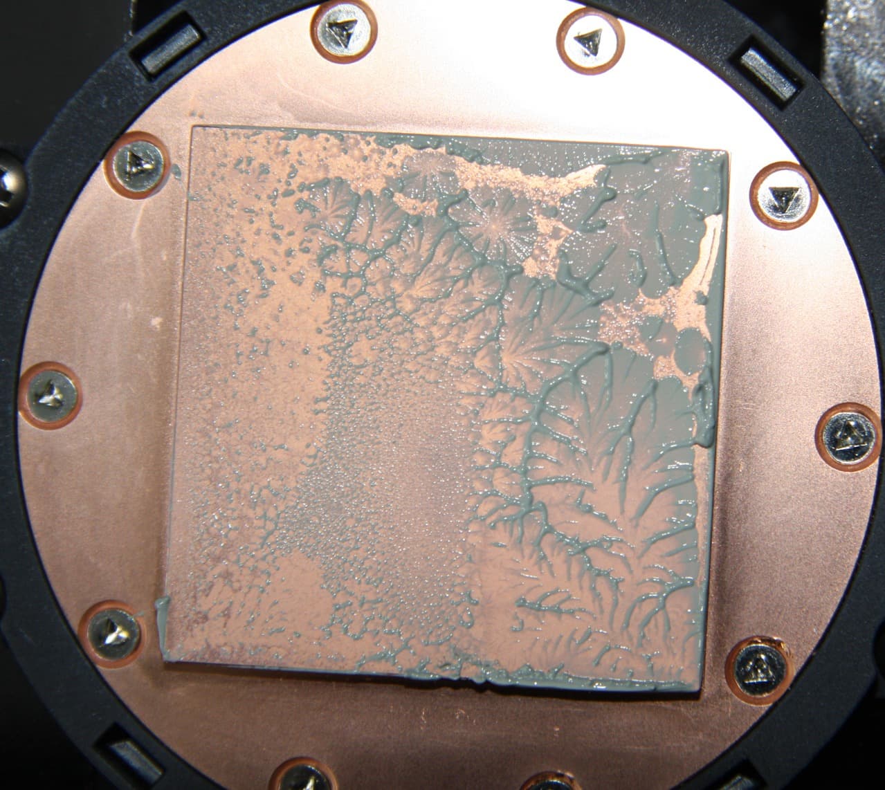 Видно, что термопаста распределилась очень тонким слоем на большей части (и главное в центре) площади крышки процессора, а ее избытки выдавились за края. Участок плотного контакта имеет большую площадь.