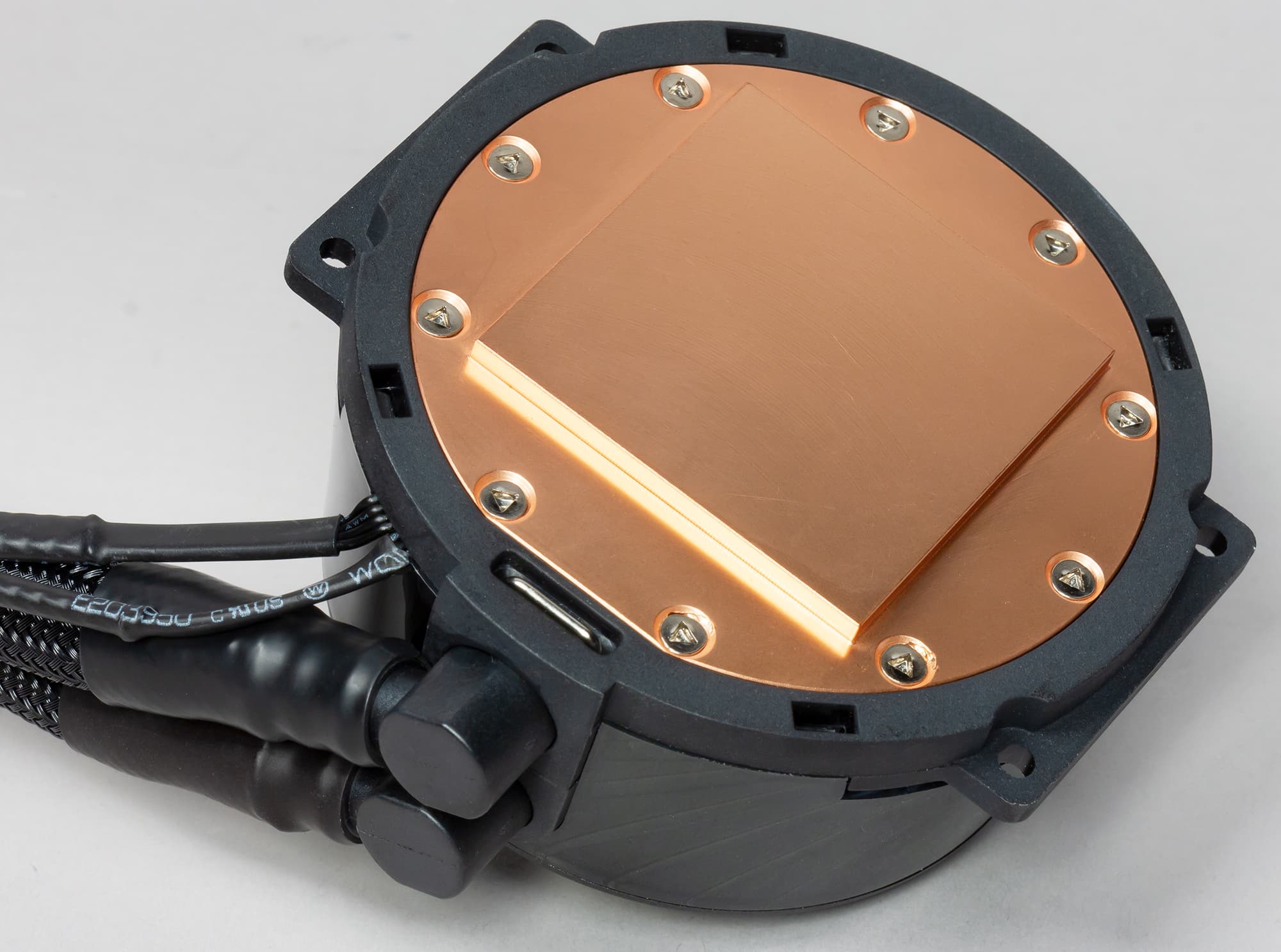 Система герметичная, заправлена, готова к использованию. Помпа интегрирована в один блок с теплосъемником. Производитель указывает, что водоблок двухкамерный, видимо сверху камера помпы, а снизу — камера теплосъемника. Подошвой теплосъемника, непосредственно прилегающей к крышке процессора, служит медная пластина с квадратным выступом. Ее внешняя поверхность шлифованная и полированная (но не до зеркального блеска) и чуть-чуть, на 0,01-0,02 мм, выпуклая к центру.
