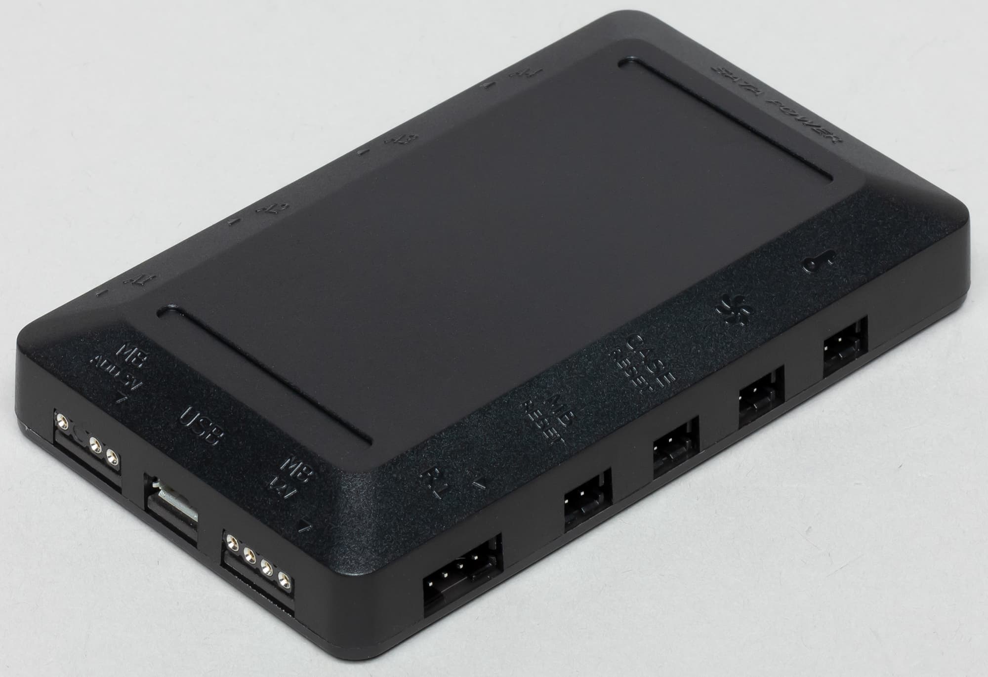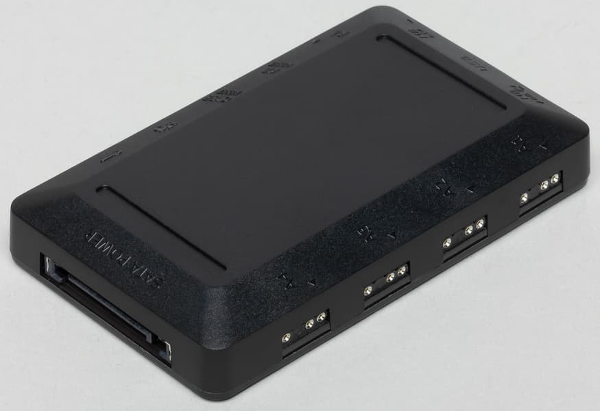 Контроллер подключается к кабелю питания SATA, что гораздо удобнее, чем к периферийному разъему («Molex»). Контроллер имеет 4 выхода (канала) для подключения устройств с адресной RGB-подсветкой (A1—4) и один выход для устройств с RGB-подсветкой (R1).