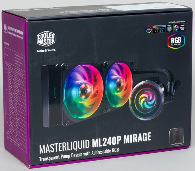 Поставляется система жидкостного охлаждения Cooler Master MasterLiquid ML240P Mirage в относительно большой коробке из среднего по толщине гофрированного картона. На внешних плоскостях коробки в цвете изображен сам продукт, а также перечислены основные особенности и технические характеристики, есть и чертежи помпы и радиатора с главными размерами. Надписи преимущественно на английском, но что-то продублировано на нескольких языках, включая русский. Для защиты и распределения деталей используются форма из папье-маше, прокладка из вспененного полиэтилена, картонная коробочка и пластиковые пакеты. Подошва теплосъемника защищена пластиковой пленкой.