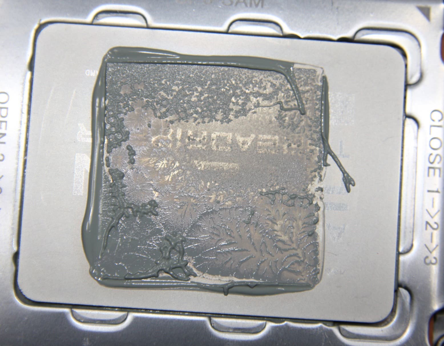 Также была проведена серия дополнительных тестов с процессором AMD Ryzen Threadripper 2990WX. Распределение термопасты на процессоре 2990WX: