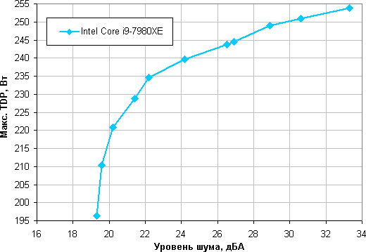 Приняв 25 дБА за критерий условной бесшумности, получим примерную максимальную мощность процессоров, соответствующих этому уровню. Это порядка 240 Вт для процессора Intel Core i9-7980XE. Если не обращать внимания на уровень шума, то пределы мощности можно увеличить где-то до 255 Вт. Еще раз уточним, это в жестких условиях обдува радиатора нагретым до 44 градусов воздухом, при снижении температуры воздуха указанные пределы мощности для бесшумной работы и максимальной мощности возрастают. В целом данная система является типичной по производительности в своем классе (на два вентилятора 120 мм).
