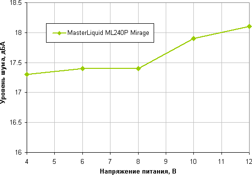 Уровень шума только от помпы равен примерно 18 дБА. Помпа работает очень тихо. Приведем зависимость уровня шума только помпы от напряжения.