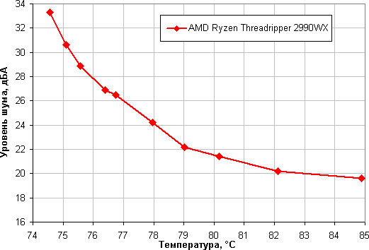 Зависимость температуры процессора AMD Ryzen Threadripper 2990WX при его полной загрузке от скорости вращения вентиляторов: