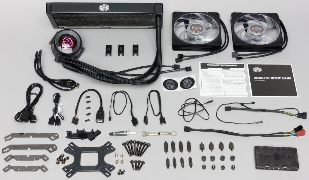 Внутри коробки находятся радиатор с подключенной помпой, вентиляторы, комплект крепежа, ключ, разветвители для подсветки и питания, инструкция по установке, описание гарантии, комплект контроллера подсветки и термопаста в шприце.