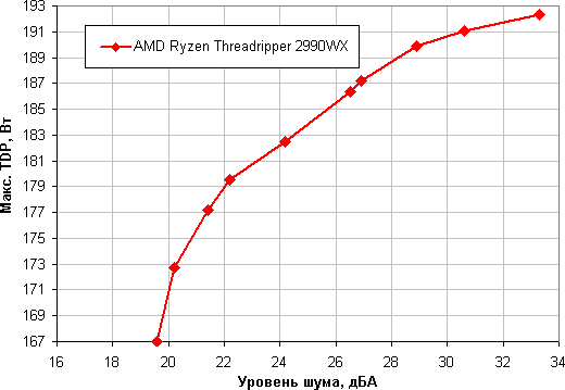 Потребляемая процессором мощность (в сумме по двум разъемам 12 В для питания процессора) меняется от 270 до 282 Вт по мере увеличения температуры процессора от 74 до 84 градусов (по данным мониторинга, напомним, что реальная температура на 27 градусов ниже). Ограничившись указанными выше условиями, построим зависимость реальной максимальной мощности (обозначенной как Макс. TDP), потребляемой процессором, от уровня шума уже в случае AMD Ryzen Threadripper 2990WX:
