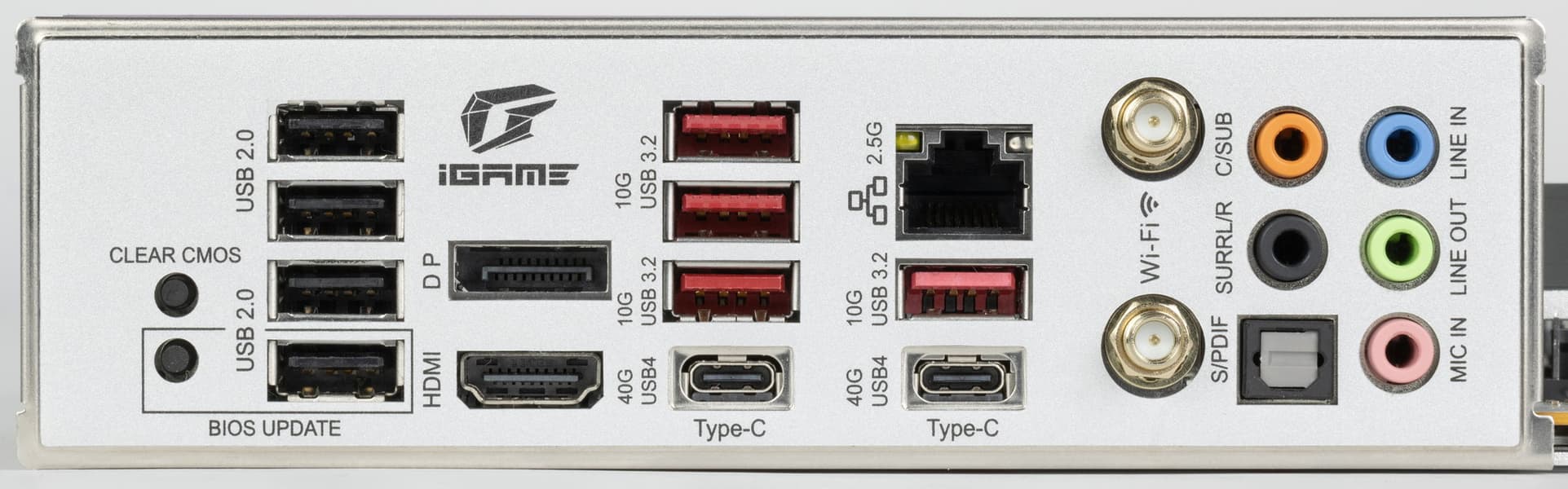 - 2 порта USB4: оба реализованы через Thunderbolt 4, встроенный в CPU и представлены двумя портами Type-C на задней панели;