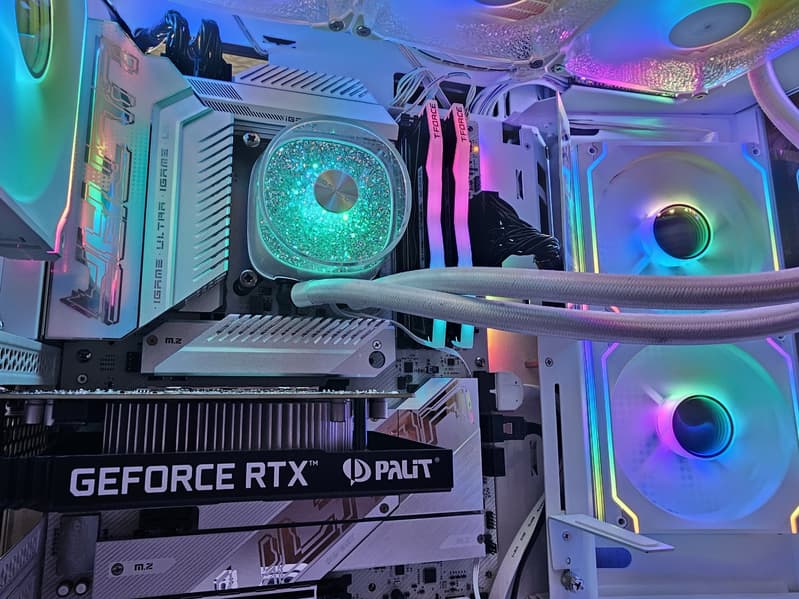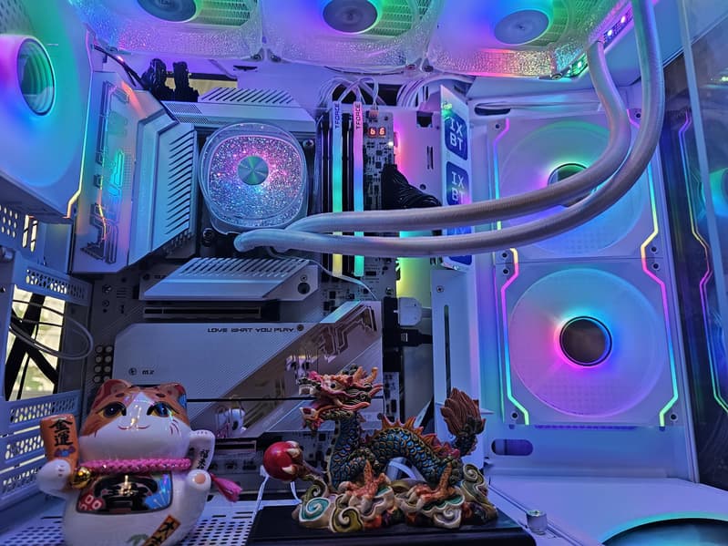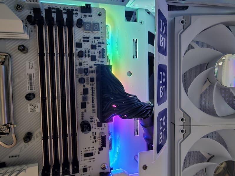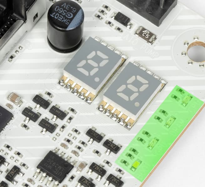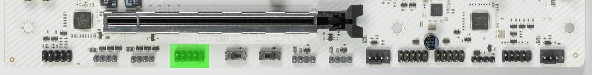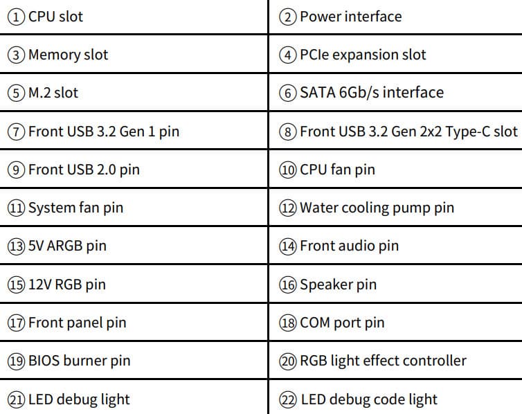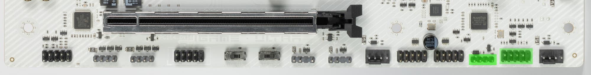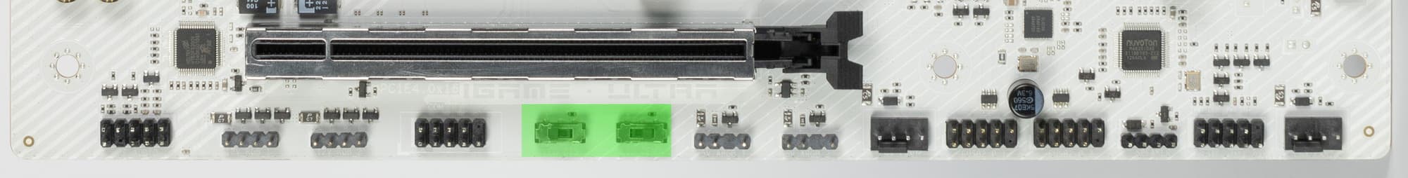| Прочие внутренние элементы | 24-контактный разъем питания ATX 2 8-контактный разъем питания EPS12V 1 слот M.2 (E-key), занят адаптером беспроводных сетей 1 разъем для подключения порта USB 3.2 Gen2x2 Type-C 1 разъем для подключения 2 портов USB 3.2 Gen1 2 разъема для подключения 4 портов USB 2.0 6 разъемов для подключения 4-контактных вентиляторов и помп ЖСО 3 разъема для подключения адресуемой ARGB-ленты 2 разъема для подключения неадресуемой RGB-ленты 1 разъем аудио для передней панели корпуса 2 переключателя подсветки LED_DIS/LED_DEMO 1 разъем COM-порта 2 разъема для подключения управления с передней панели корпуса |