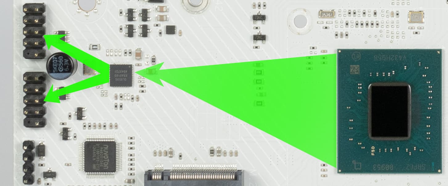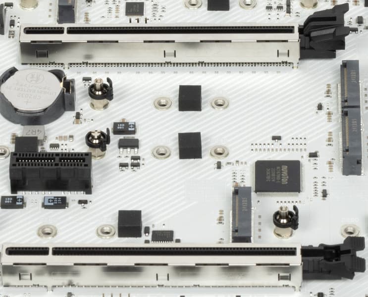 Поскольку нет деления ресурсов уже между слотами M.2, портами SATA и слотами расширения PCIe, то и мультиплексоров нет.