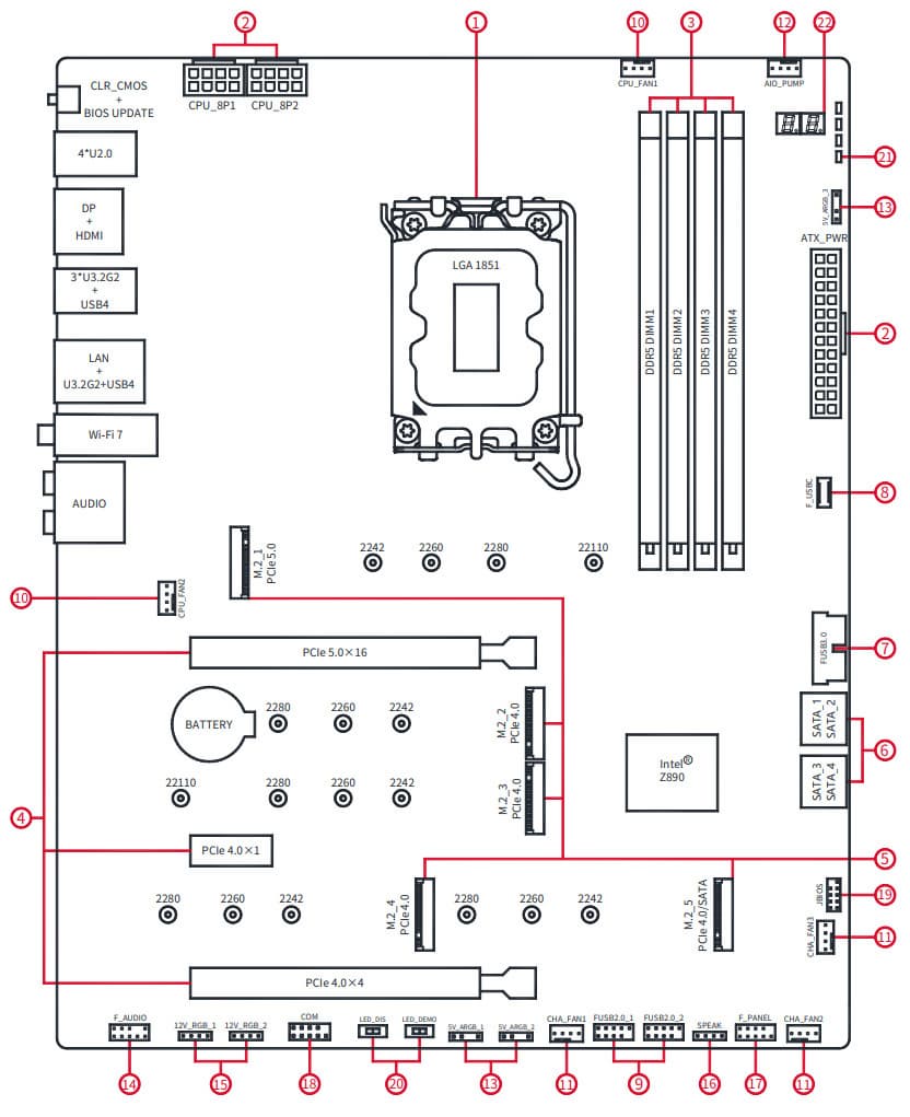 - 1 порт USB 3.2 Gen2x2: реализован с помощью Z890 и представлен одним внутренним портом Type-C (для подключения к соответствующему разъему на передней панели корпуса);