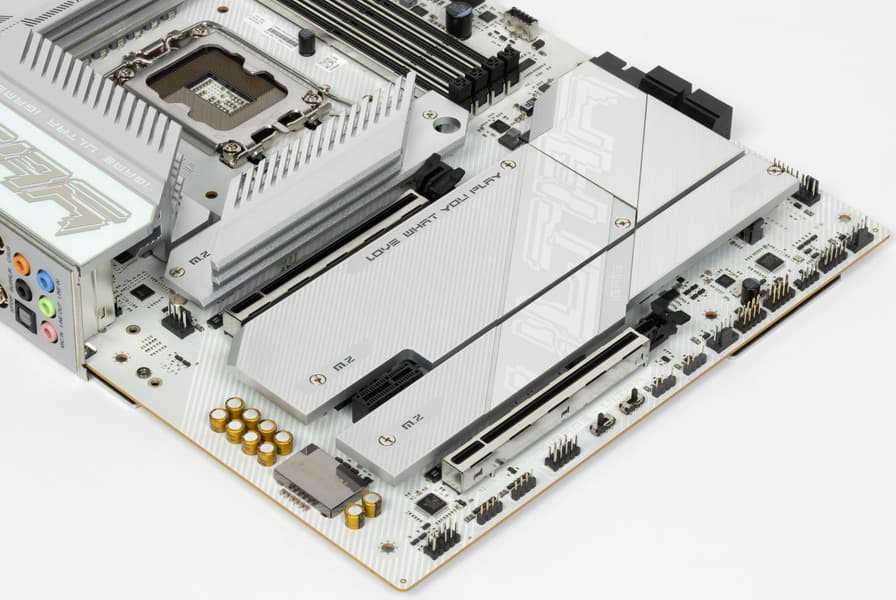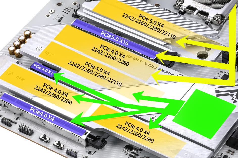 Третий, четвертый и пятый слоты M.2 (M.2_3 – M.2_5) получают данные от чипсета Z890, а первые два — от CPU, при этом M.2_1 получает PCIe 5.0, а M.2_2 получает от процессора PCIe 4.0.