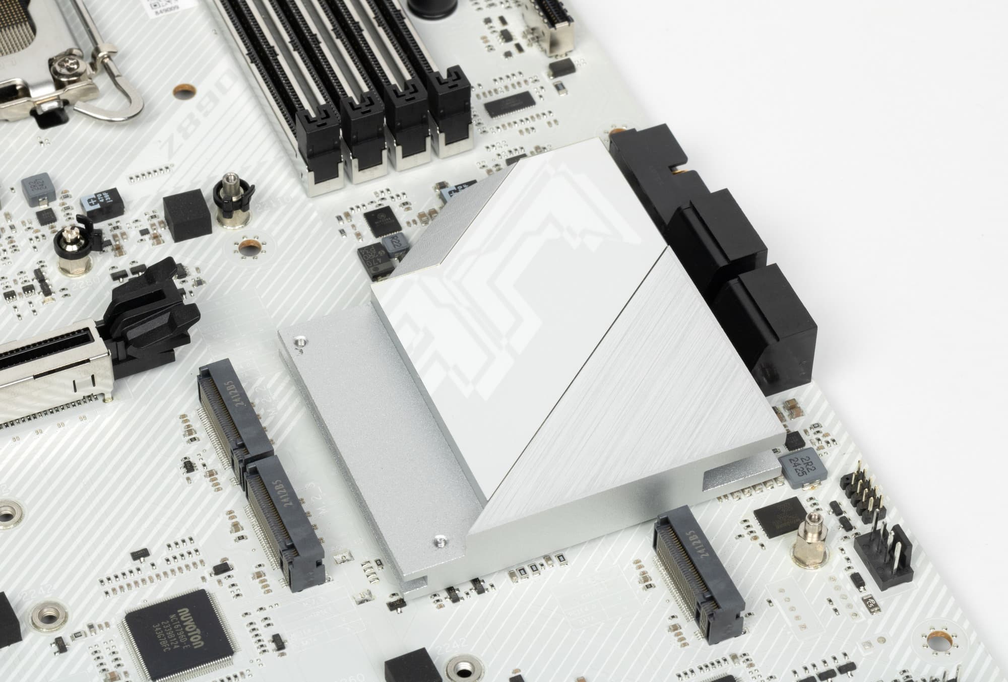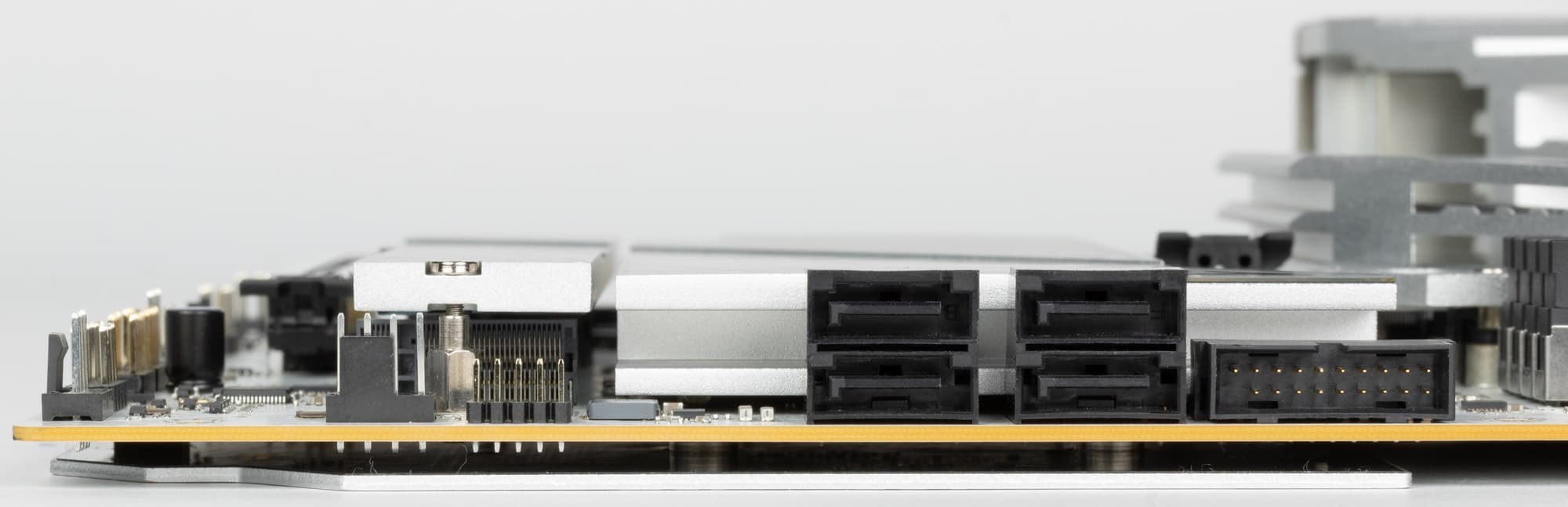 Как я уже упоминал ранее, M.2 слоты также имеют радиаторы: у верхнего — свой персональный радиатор, у остальных — общие по-парно.
