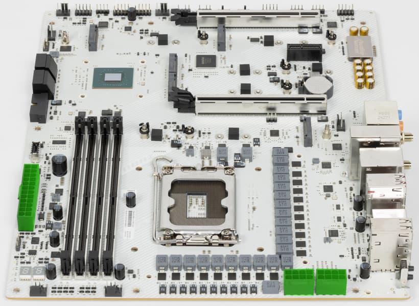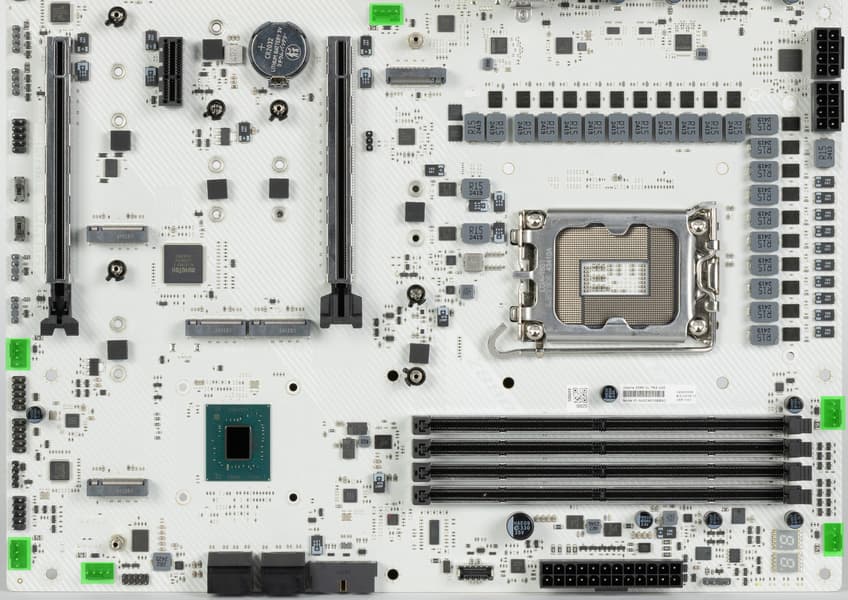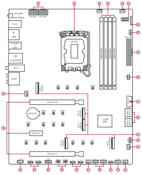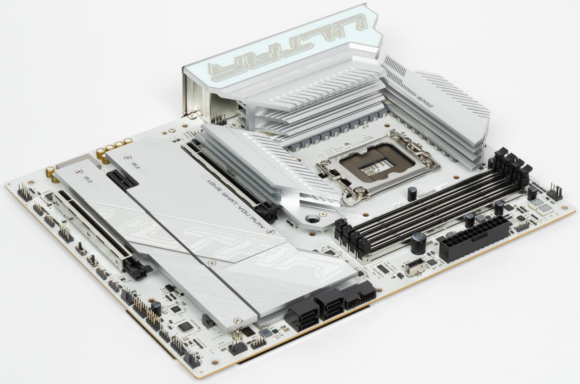 У нее имеется 17 портов USB разных видов, включая 2 USB4, один USB 3.2 Gen2×2 в виде внутреннего порта Type-C и 8 портов USB 3.2 Gen2/1. Также плата предлагает слот PCIe х16, получающий от процессора 16 линий PCIe 5.0, слот PCIe x1 и второй «длинный» слот, работающий в режиме x4 — последние подключены к чипсету. У платы 5 слотов M.2, два из которых подключены напрямую к процессору: один — линиями PCIe 4.0, второй — линиями PCIe 5.0. Три других слота М.2 подключены к чипсету Z890 линиями PCIe 4.0.