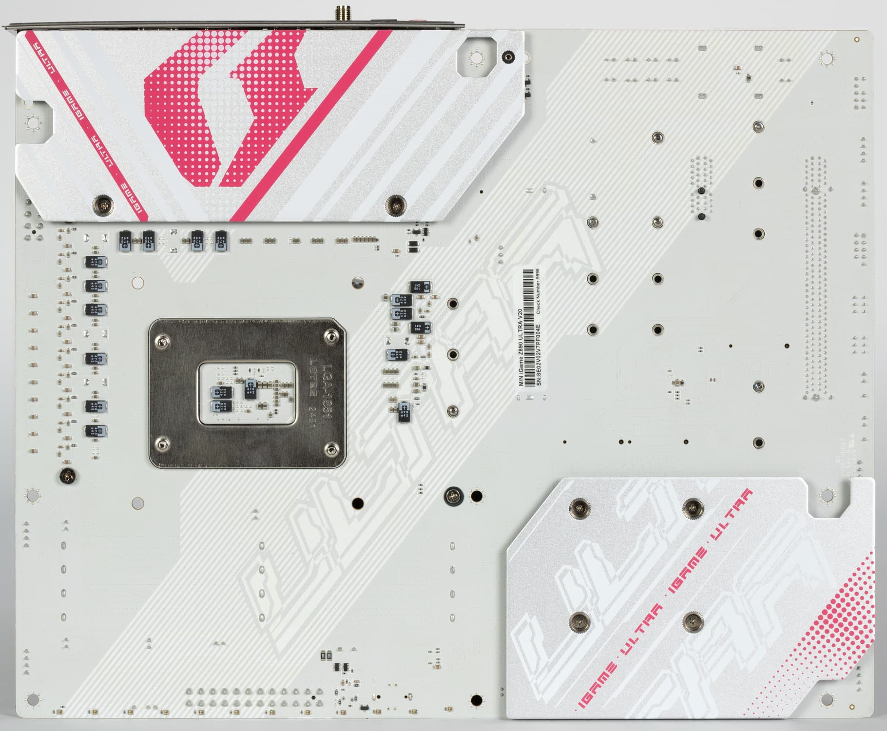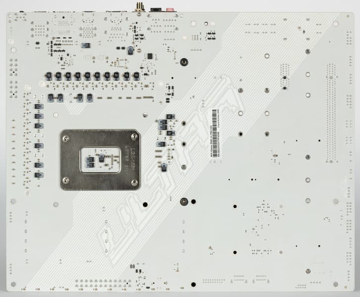 На этой (тыльной) стороне платы имеются два сегмента защитной пластины (бэкплейта). Именно сегмента (в районе задних портов ввода-вывода и в районе системного чипсета). Почему нельзя было установить полноценный бэкплейт – вопрос.