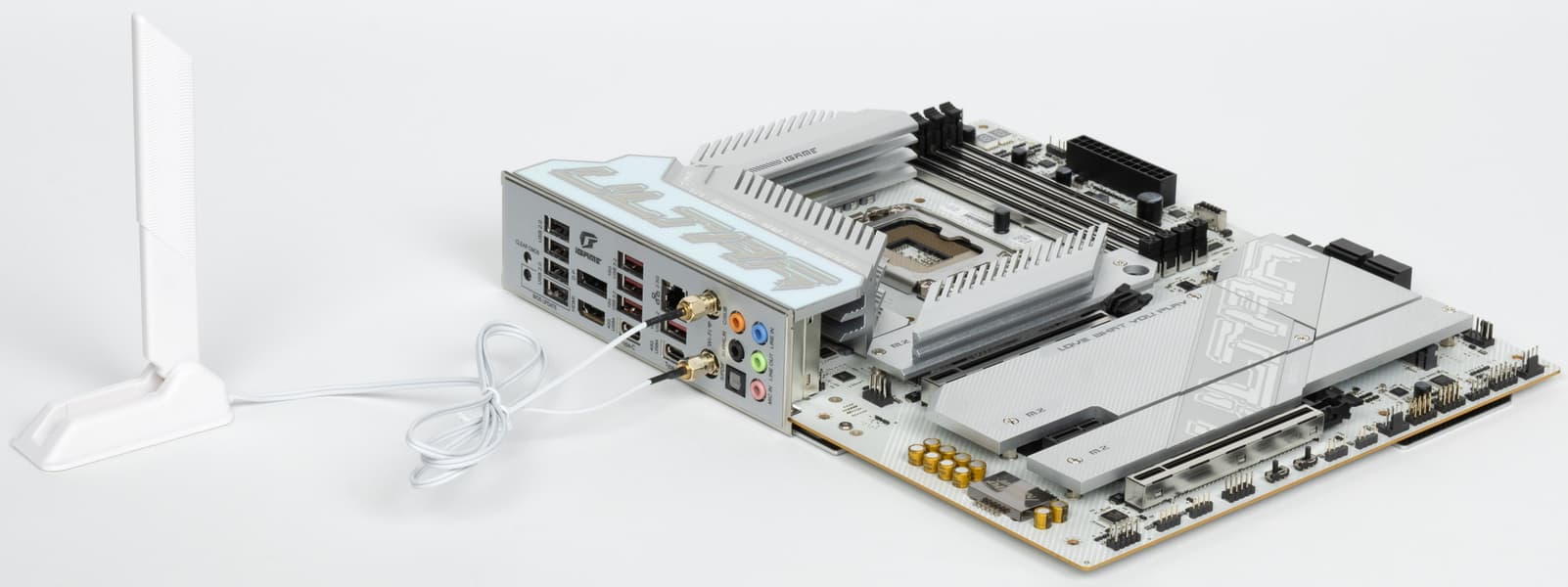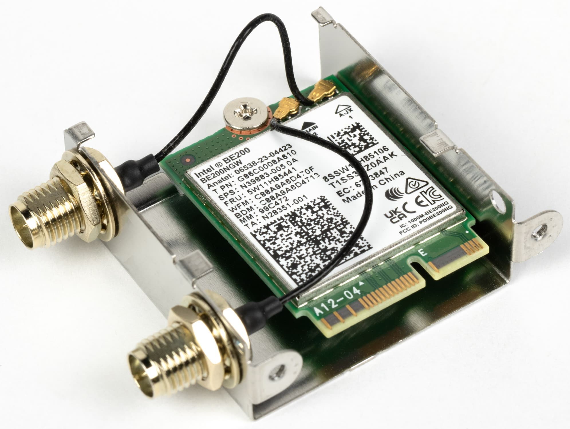 Имеется и комплексный беспроводной адаптер на контроллере Intel BE200, через который реализованы Wi-Fi 7 (802.11a/b/g/n/ac/ax/be, 2,4/5/6 ГГц) и Bluetooth 5.4. Он установлен в слот M.2 (E-key), и его разъемы для выносных антенн выведены на заднюю панель.