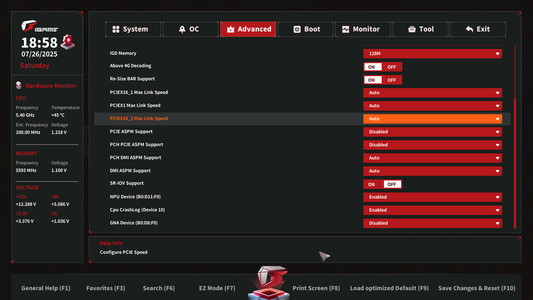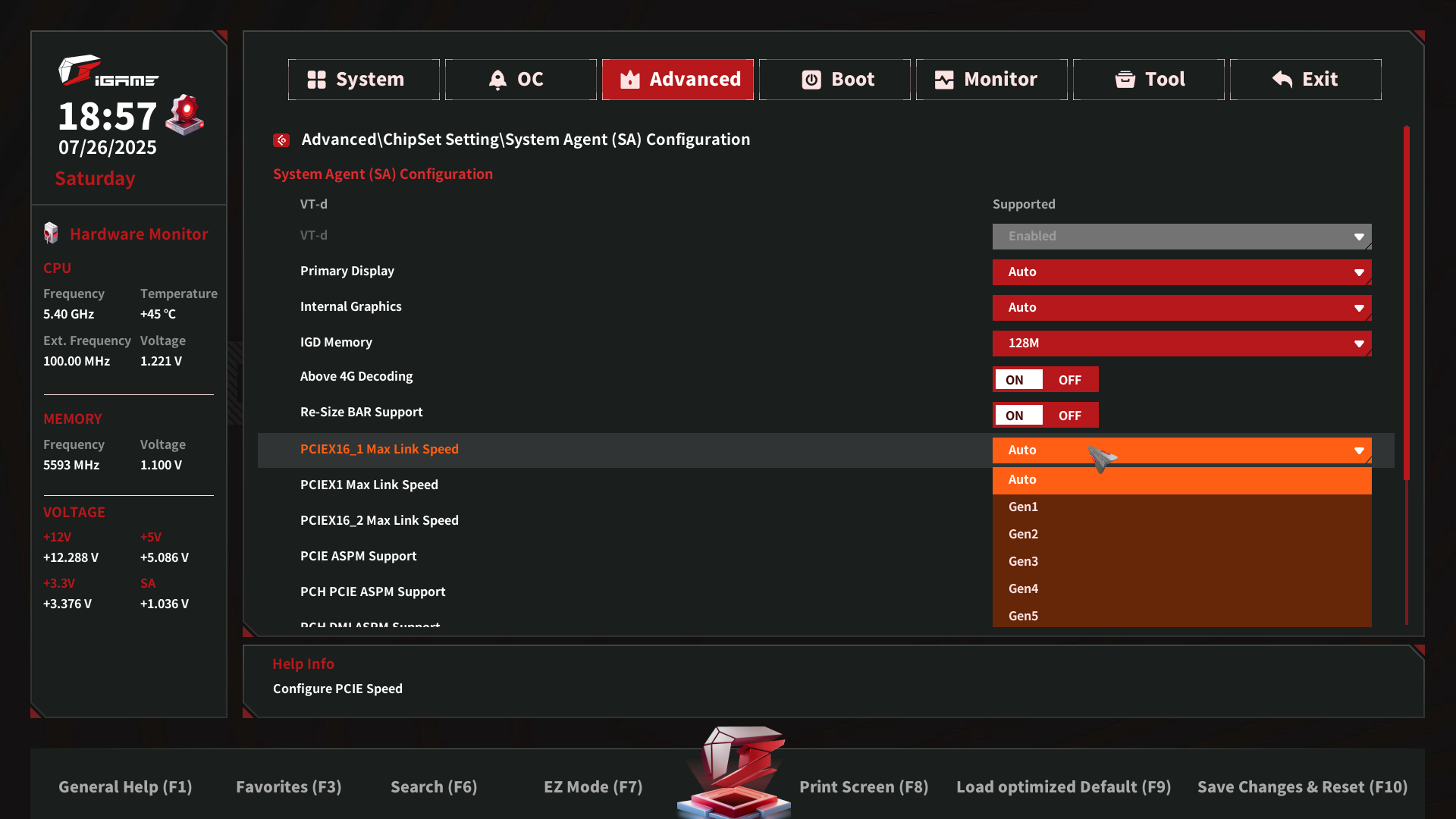 Теперь посмотрим выше на то, как работают процессоры в данной конфигурации. У CPU Core Ultra 2xx всего 24 линии PCIe, из них 4 линии версии PCIe 5.0 отведены на порт М.2 (M.2_1), 4 линии версии PCIe 4.0 отведены на порт М.2 (M.2_2) . Оставшиеся 16 линий PCIe 5.0 идут на слот PCIe x16_1. Так что вариантов переключения линий PCIe 5.0 между слотами нет (имеется только возможность на первом слоте задать конфигурацию 16 линий: x16, x8+x8, x8+x4+x4, это на случай установки в данный слот карты расширения с портами M.2).