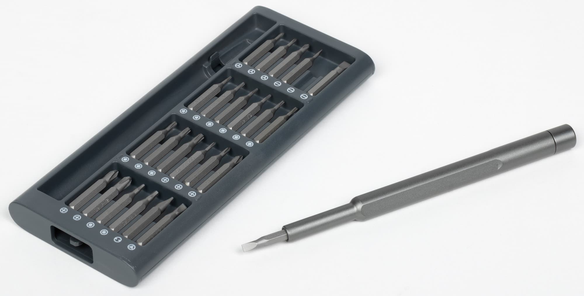 В комплект поставки входит фирменный комплект насадок для отвертки, включая последнюю (подобные наборы также выпускает китайская компания Xiaomi).