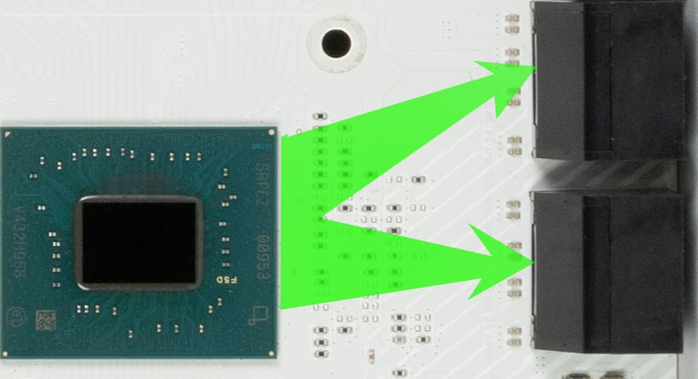 19 линий PCIe оказались занятыми, плюс 4 порта SATA. 1 линия USB 2.0 расходуется на связь с Realtek RTL1220, плюс один USB 2.0 расходуется на поддержку BT, а также иные контроллеры для своих нужд используют сигнальные линии USB 2.0 и 3.2 Gen1/2. Детально об этом ниже в разделе USB-портов.