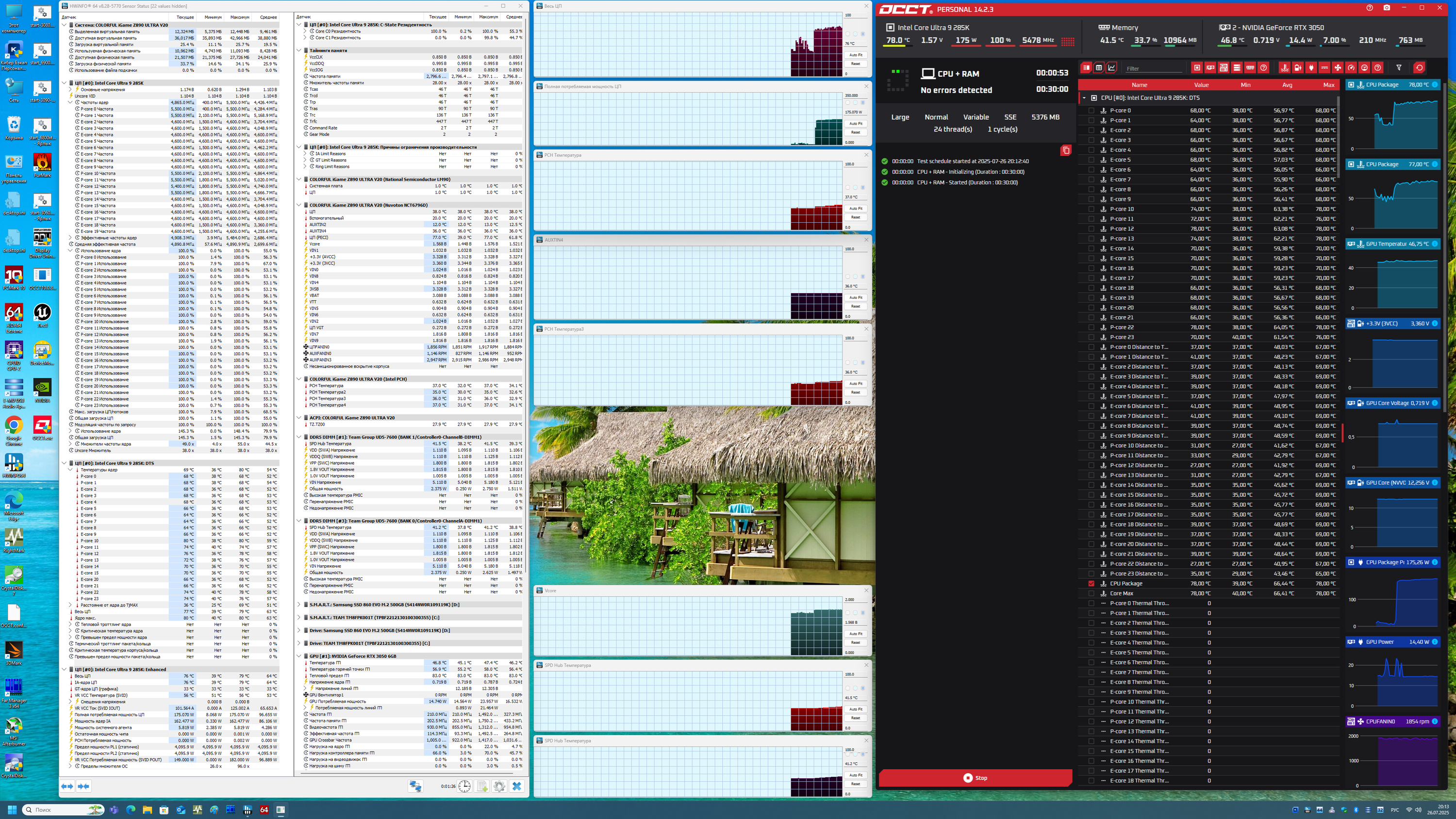 В режиме авторазгона мы получили до 5,4 ГГц по P-ядрам, и 4.6 ГГц по всем Е-ядрам. Напомню, что начиная с этого поколения процессоров, все ядра имеют по 1 потоку, то есть гипертрейдинга (многопоточности) теперь нет. Потребление процессора достигало 162 Вт, и не забываем, что данный режим работы стоит по умолчанию, что уже означает, что львиная доля пользователей его и будет использовать, а значит следует брать его как базис. Замечу, что на реальной производительности в каких-либо задачах все это не особо сказывается: потребляет процессор 160 или 180 Вт – вы получите разницу в производительности не более 1,5%, что в рамках погрешности измерений. Разумеется, следует учитывать, что мы выводы делаем на основе стресс-теста, а таких режимов работы CPU в обычных массовых задачах не бывает. Даже программы моделирования, рендеринга и т.п. сейчас процессорные мощности используют не полностью (много оптимизаций, которые возлагают часть вычислений на ту же видеокарту).