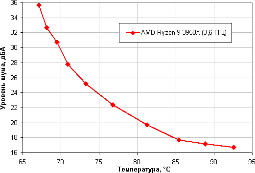 В качестве дополнительного теста мы решили посмотреть, как кулер справится с охлаждением AMD Ryzen 9 3950X. Процессоры семейства Ryzen 9 являются сборками из трех кристаллов под одной крышкой. С одной стороны, увеличение площади, с которой снимается тепло, может улучшить охлаждающую способность кулера, но с другой — конструкция большинства кулеров оптимизирована для лучшего охлаждения именно центральной области процессора. Видимо, из-за этих особенностей есть мнение, что подобрать воздушный кулер для топовых процессоров Ryzen нового поколения не очень просто. В тестах использовался указанный процессор и материнская плата ASRock X570 Taichi. Все ядра процессора работали на фиксированной частоте 3,6 ГГц (множитель 36). Для установки этой частоты использовалась программа A-Tuning производителя системной платы. В качестве нагрузочного теста применялась программа powerMax (с использованием системы команд AVX). Потребление процессора при замерах по двум дополнительным разъемам 12 В на материнской плате под нагрузкой менялось от 153 Вт при 66 °C температуры процессора до 166 Вт при 92 °C.