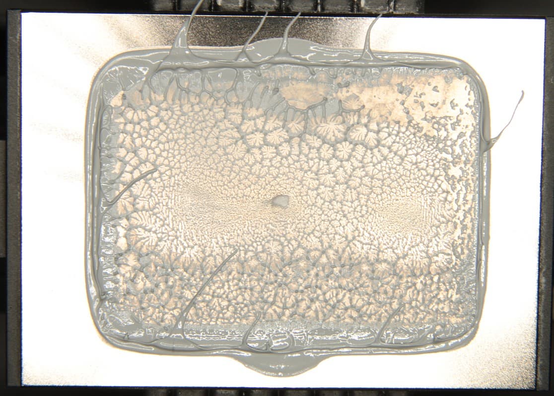 Видно, что термопаста распределилась тонким слоем по всей плоскости крышки процессора, а ее избыток выдавился по краям. Пятно плотного контакта большое.