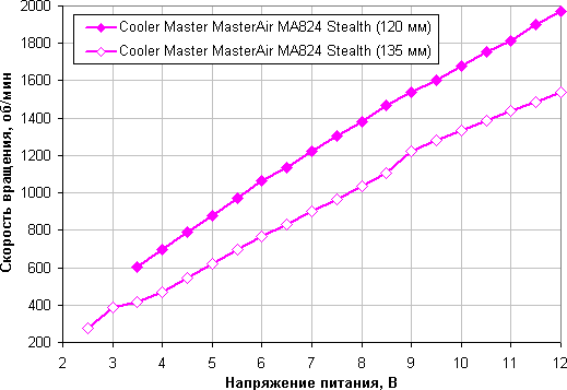 Диапазон регулировки с помощью напряжения также довольно широкий. Вентиляторы останавливается при снижении напряжения до 3,0 В в случае 120 мм и 2,0 В в случае 135 мм, а запускаются от 3,3 В и 3,4 В соответственно. Вентиляторы вполне допустимо подключать к источнику с напряжением 5 В. На графиках ниже приведена скорость вращения вентилятора 120 мм.