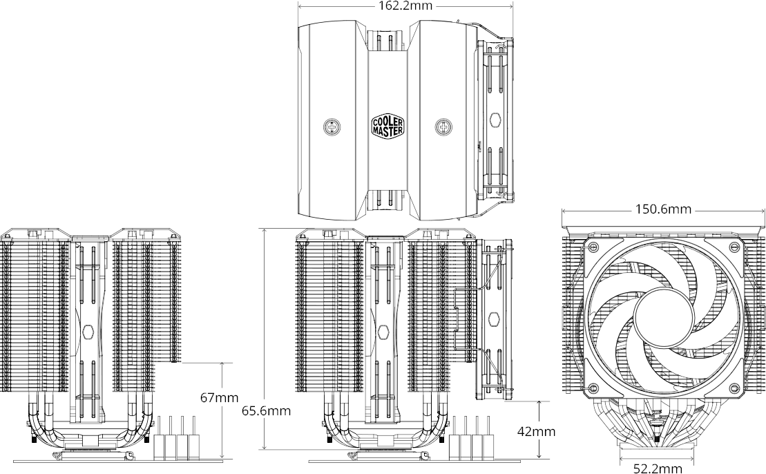 Однако на радиаторе часть пластин имеют уменьшенную глубину, а внешний вентилятор можно сместить вверх, что, согласно нашим измерениям, позволит использовать модули памяти высотой до 66 мм. Если не поднимать вентилятор выше радиатора — до 47 мм. Размеры, указанные производителем: