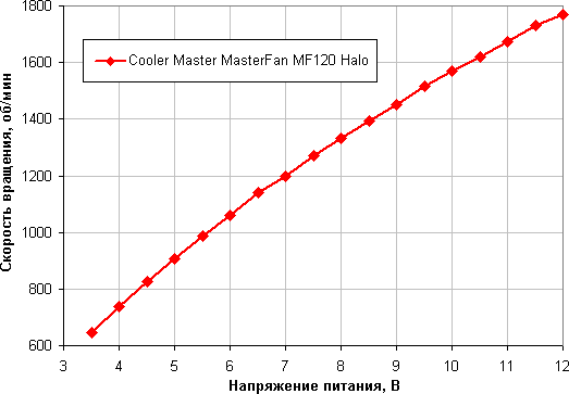 Характер зависимости типичный: плавное и чуть нелинейное снижение скорости вращения от 12 В до напряжения остановки. При желании вентиляторы можно подключать к 5 В.