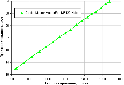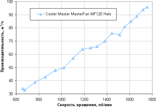 Напомним, что в этом тесте мы создаем некое аэродинамическое сопротивление (весь поток воздуха проходит через крыльчатку анемометра), поэтому полученные значения отличаются в меньшую сторону от максимальной производительности в характеристиках вентилятора, так как последняя приводится для нулевого статического давления (отсутствует аэродинамическое сопротивление).