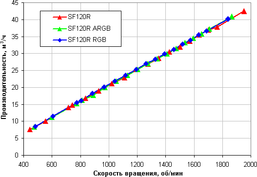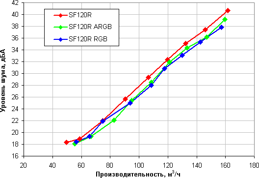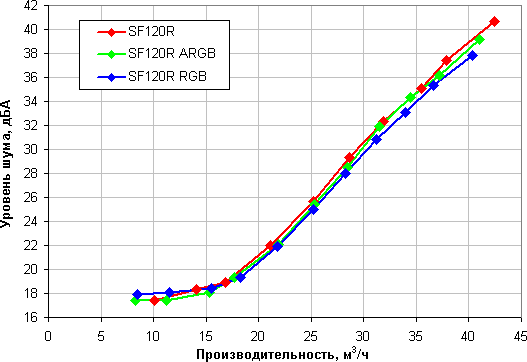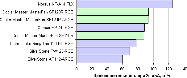 В современных условиях и в потребительском сегменте эргономика, как правило, имеет приоритет над производительностью, поэтому зафиксируем уровень шума на значении 25 дБА. Теперь для оценки вентиляторов достаточно сравнивать их производительность при данном уровне шума.