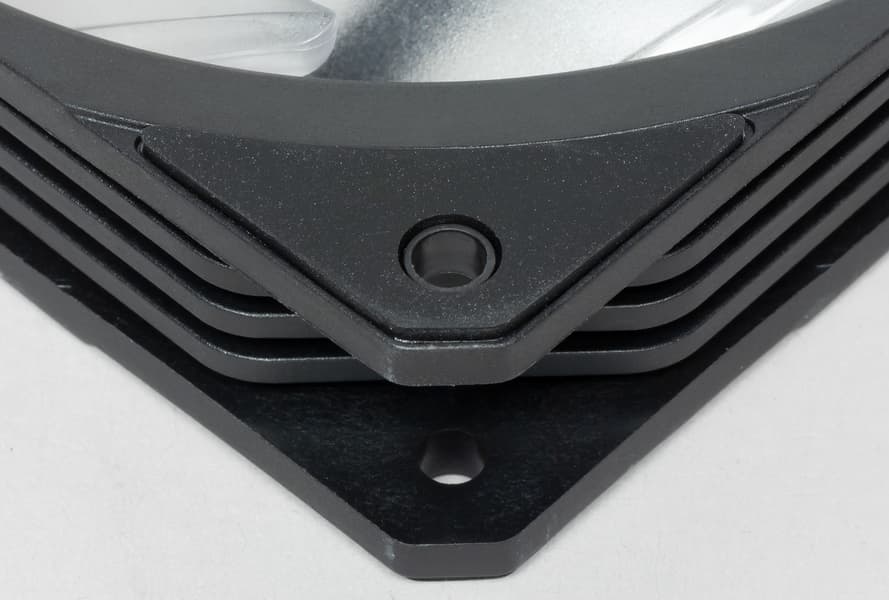 Рамка вентилятора изготовлена из черного прочного пластика. На ней есть ребра жесткости, что исключает возможные резонансные явления, которые могут привести к вибрации и увеличению шума при работе вентилятора. С менее жестки рамками такое возможно и уже нами встречалось.
