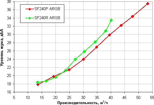 Отметим, что замеры уровня шума в отличие от определения производительности выполнялись без аэродинамической нагрузки, поэтому скорость вращения вентилятора SF240P ARGB была существенно выше (примерно на 15%) во время измерения шума при тех же входных параметрах. Для компенсации этого мы выполнили пересчет производительности к тем скоростям, что были измерены при замере уровня шума. В случае SF240R ARGB этого не потребовалось, так как в нем есть стабилизация скорости вращения (см. выше). Чем ниже и правее находится точка на графике выше, тем лучше вентилятор — работает тише, дует сильнее. Видно, что при сравнении двух вентиляторов на большей части диапазона SF240R ARGB ведет себя чуть хуже — больше шумит при той же производительности.