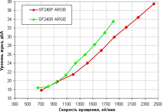 Отметим, что ниже примерно 18 дБА фоновый шум помещения и шумы измерительного тракта шумомера уже гораздо выше шума от вентилятора. Судя по отсутствию выраженных перегибов, явные резонансные эффекты отсутствуют — конструкция рамки у обоих вентиляторов достаточно жесткая. Видно, что при равных скоростях вращения крыльчаток вентилятор SF240R ARGB немного шумнее.
