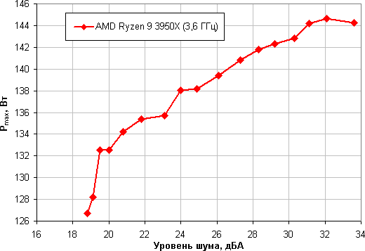 Приняв 25 дБА за критерий условной бесшумности, получим, что максимальная мощность процессора, соответствующая этому уровню, составляет порядка 138 Вт. Если не обращать внимания на уровень шума, то предел мощности можно увеличить где-то до 144 Вт. Еще раз уточним: это в жестких условиях обдува радиатора нагретым до 44 градусов воздухом. При снижении температуры воздуха указанные пределы мощности для бесшумной работы и максимальной мощности возрастают. Результат заметно хуже, чем в случае процессора Intel Core i9-7980XE. Впрочем, при условии достаточно хорошей вентиляции в корпусе данный кулер вполне справится с охлаждением процессора AMD Ryzen 9 3950X, но на возможность существенного разгона рассчитывать уже не стоит.