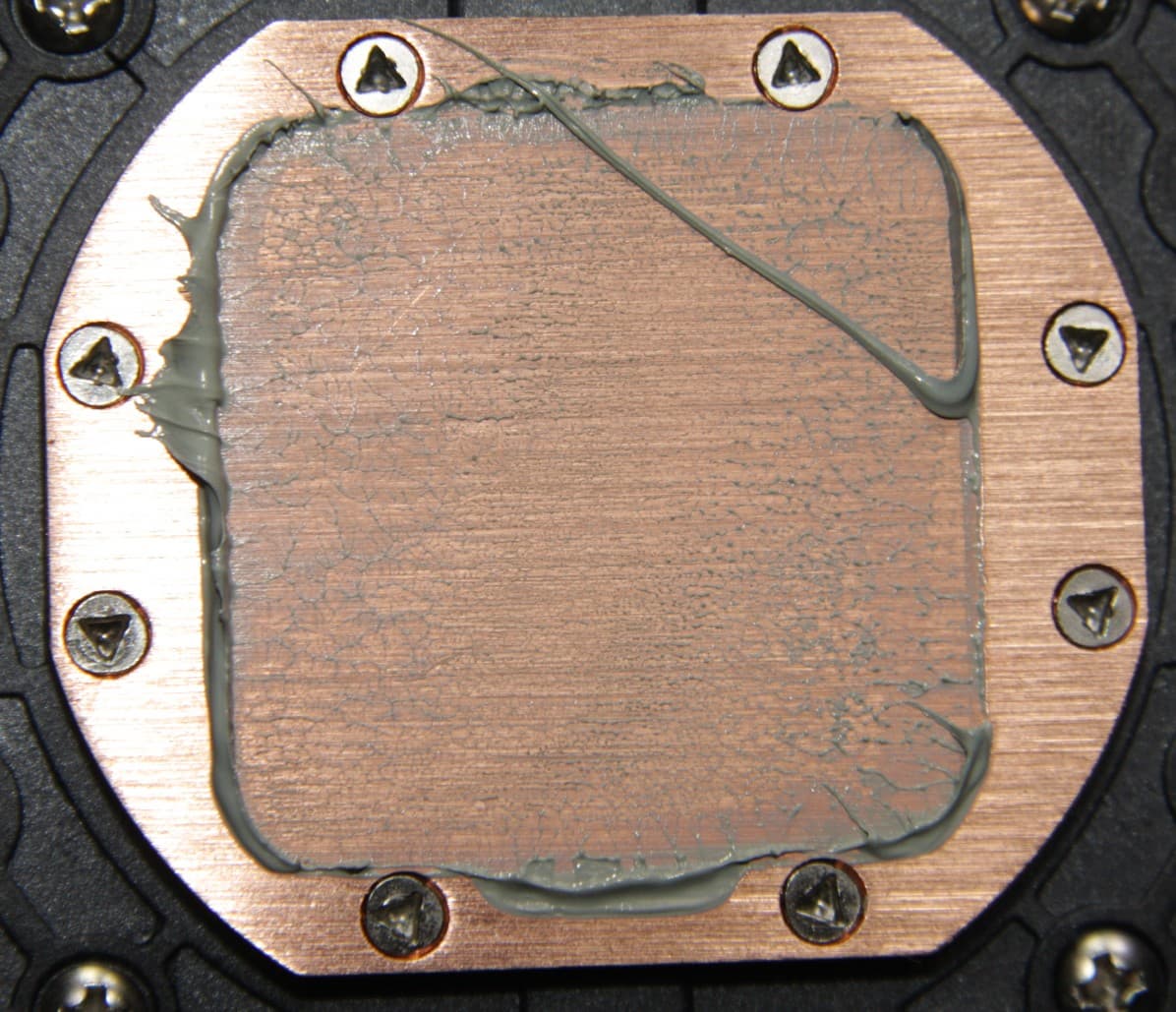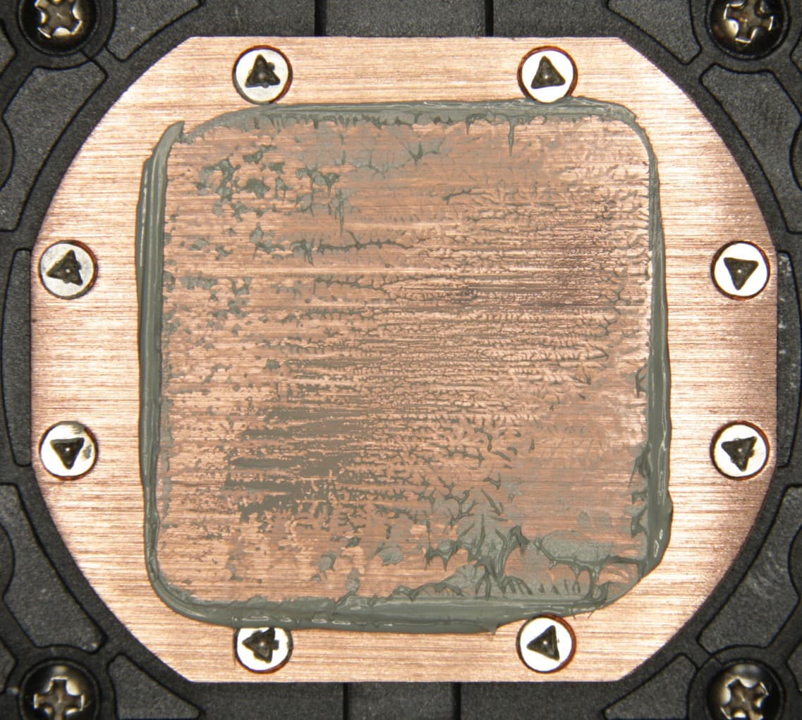 Габариты этой пластины — 58×50 мм, а внутренняя часть, ограниченная отверстиями под винты, имеет размеры примерно 47×39 мм. Термопаста в маленьком шприце, что, конечно, менее удобно, чем преднанесенный слой. Комплектного запаса термопасты должно хватить раза на два в случае процессоров с небольшой площадью крышки и при экономном расходе. В тестах использовалась не менее качественная термопаста другого производителя. Забегая вперед, продемонстрируем распределение термопасты после завершения всех тестов. На процессоре Intel Core i9-7980XE: