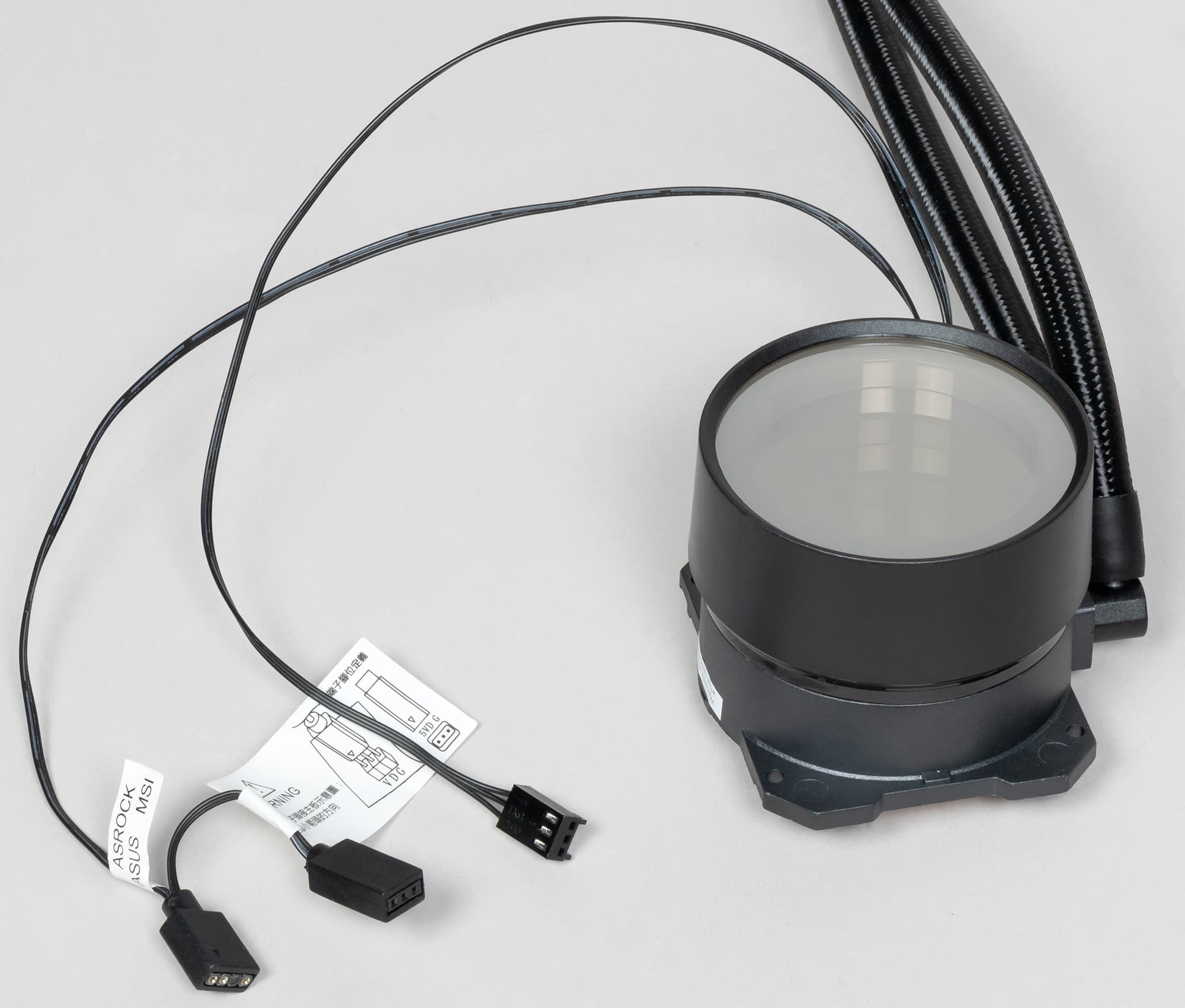 Под этой крышкой находится кольцевой светорассеиватель из белого полупрозрачного пластика, ниже которого расположена перегородка с зеркальной поверхностью, через которую просвечивает логотип и широкое кольцо по периметру. В итоге при включенной подсветке кольцо и логотип многократно отражаются между перегородкой и крышкой, формируя эффект уходящего вниз тоннеля. Адресуемые RGB-светодиоды подсветки управляются извне по трехпроводному интерфейсу. На подсветку помпы идет отдельный кабель с двумя трехконтактными входными разъемами типа «мама» разного типа.