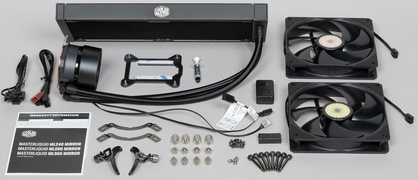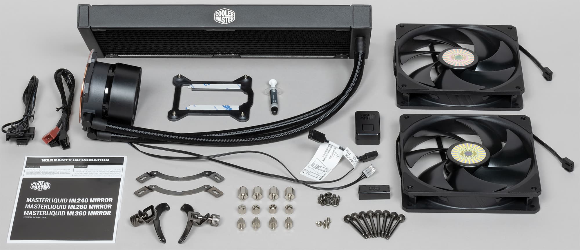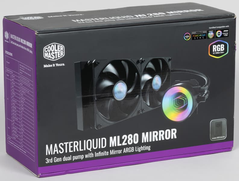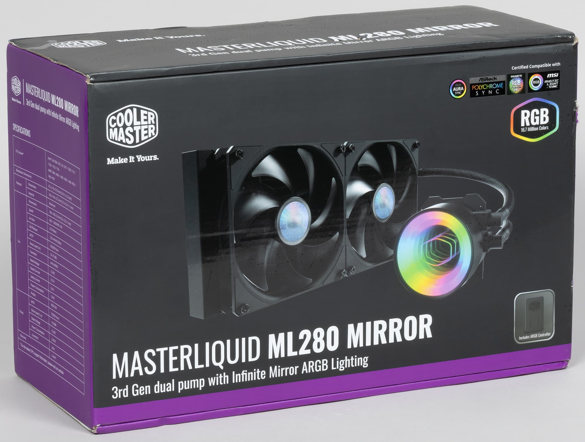 Поставляется система жидкостного охлаждения Cooler Master MasterLiquid ML280 Mirror в коробке из среднего по толщине гофрированного картона, оформленной с использованием фирменных цветов. На внешних плоскостях коробки в цвете изображен сам продукт, а также перечислены основные особенности (с иллюстрациями) и технические характеристики, есть и чертежи помпы и радиатора с главными размерами. Часть изображений залакированы. Надписи преимущественно на английском, но некоторые из них продублированы на нескольких языках, включая русский. Для защиты и распределения деталей используются форма из папье-маше, прокладки из вспененного полиэтилена и пластиковые пакеты. Подошва теплосъемника защищена пластиковой пленкой.