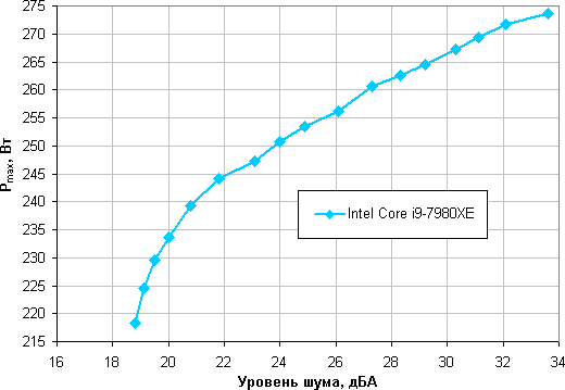 Приняв 25 дБА за критерий условной бесшумности, получим примерную максимальную мощность процессоров, соответствующих этому уровню. Это порядка 253 Вт для процессора Intel Core i9-7980XE. Если не обращать внимания на уровень шума, то пределы мощности можно увеличить где-то до 275 Вт. Еще раз уточним, это в жестких условиях обдува радиатора нагретым до 44 градусов воздухом, при снижении температуры воздуха указанные пределы мощности для бесшумной работы и максимальной мощности возрастают.