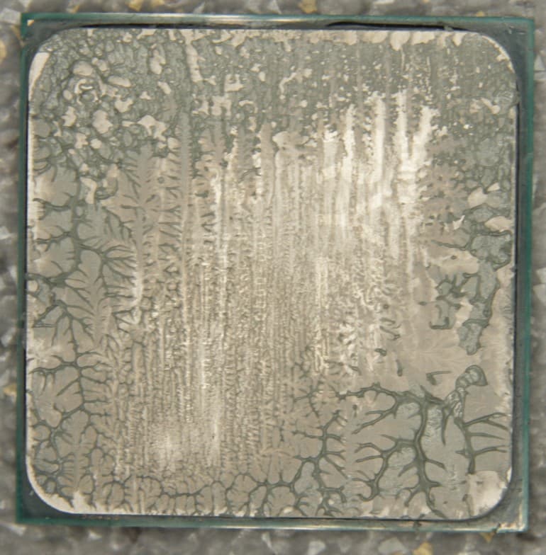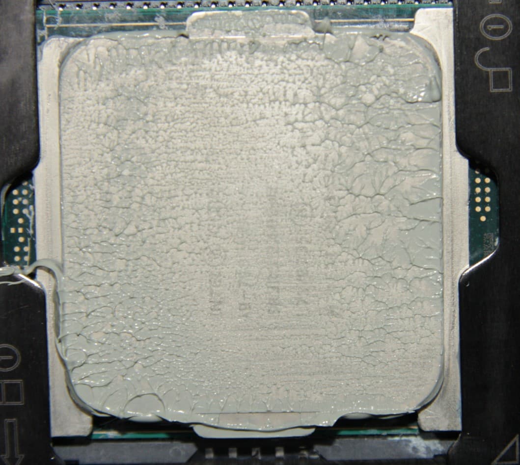 Видно, что термопаста распределилась очень тонким слоем на большей части площади крышки процессора, а ее избытки выдавились за края. Участок плотного контакта имеет большую площадь.