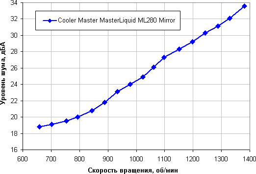 Уровень шума от этой системы охлаждения невысокий во всем диапазоне скорости вращения вентиляторов. Зависит, конечно, от индивидуальных особенностей и других факторов, но где-то от 40 дБА и выше шум, с нашей точки зрения, очень высокий для настольной системы; от 35 до 40 дБА уровень шума относится к разряду терпимых; ниже 35 дБА шум от системы охлаждения не будет сильно выделяться на фоне типичных небесшумных компонентов ПК — корпусных вентиляторов, вентиляторов на блоке питания и на видеокарте, а также жестких дисков; а где-то ниже 25 дБА кулер можно назвать условно бесшумным. Фоновый уровень был равен 16,0 дБА (условное значение, которое показывает шумомер). Уровень шума только от помпы, когда она работает на максимальной скорости, равен 18 дБА.Помпа работает очень тихо, поэтому снижать шум от системы, уменьшая напряжение питания помпы, смысла нет.